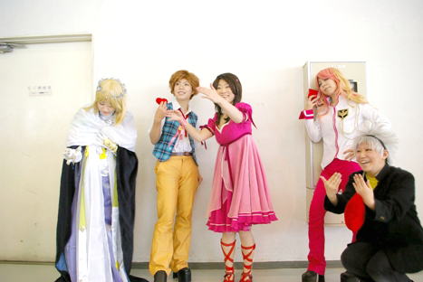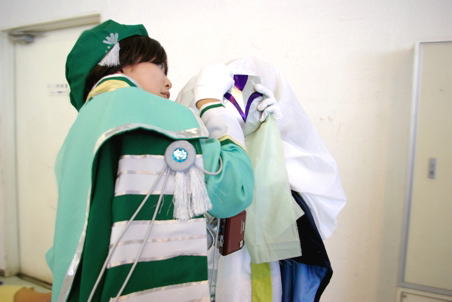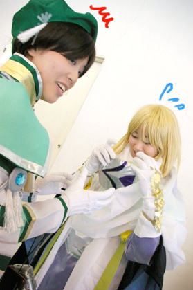 | アンジェシリーズで、集合写真を、撮ろうと準備中ですが。。。。 なえ様は、衣装を整え中。ズリズリ系は、1ポーズごとに、大変ですよね; オリヴィエ様は、『いつでも、OKよんv』って、余裕なご様子v 遠慮して、入ろうとしないディオンを、コレットとランディー様が、一生懸命誘う♪ そして、一番面白かったのが、ゼフェル様でした!! 遠慮するディオンに『何してるんだ!入れよっ!!』って、満面の笑みの 『カモーンッ☆』って!!(大爆笑)もう、最高ですvvあぁ〜楽しかった♪ |
